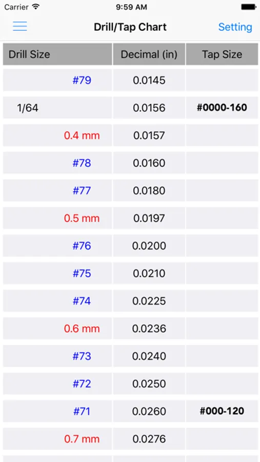 - Drill/Tap Chart available in drill size standards: Fractional, Letter, Wire Gauge and Metric