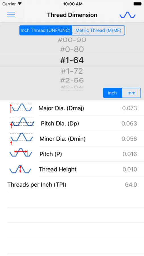 - Thread Dimension Information: Major Dia, Pitch Dia, Minor Dia, Pitch, Thread Height, Threads per Inch