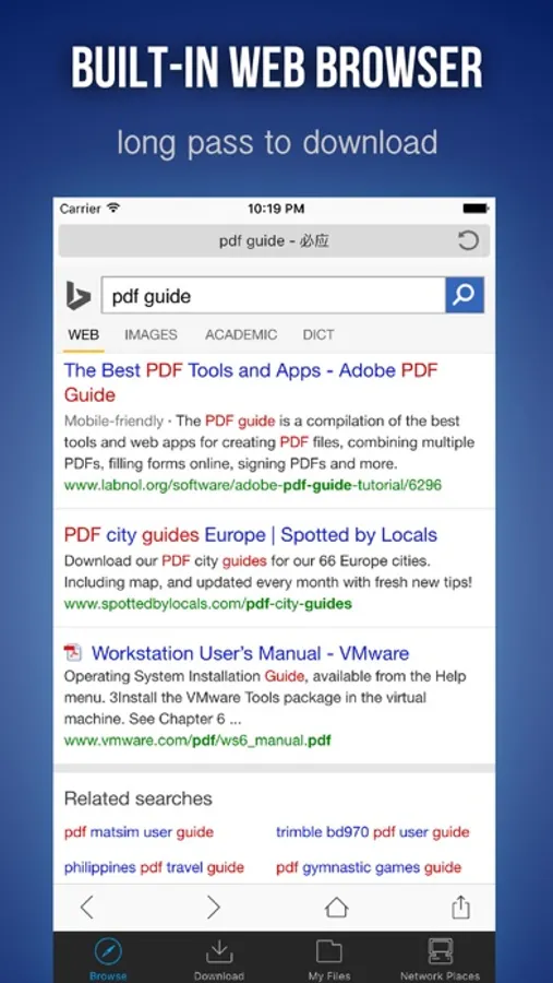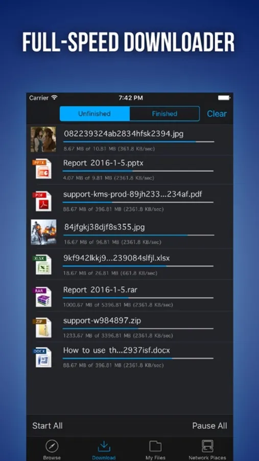 With i.Files, you can achieve high-speed file downloads from websites direct to your iPhone/iPod, and browse most common file formats. The secret behind i.Files' rapid download speed is its multi-thread download technology, which simultaneously uses multiple threads to download the same file. You'll notice the speed often meets or even slightly exceeds your bandwidth limit. In addition, it will resume interrupted downloads from the point where they broke off.