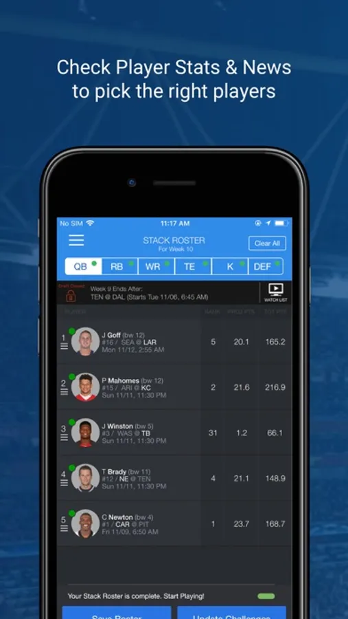 - Get real-time player statistics, projections and the latest news related to your roster so you can adjust your Stack Roster each week. You now get to play using all of your favorite players vs being locked in from the start of the season.