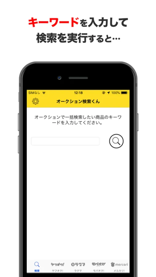 - キーワードを入力して検索を実行すると、メルカリ、ヤフオク、ラクマ、モバオクの商品検索結果がタブ別に表示されます。