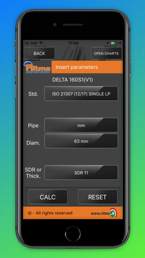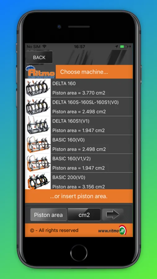 • Choice of welding machine: from list of Ritmo butt fusion hydraulic machines or free insertion of the thrust section of the cylinders (cm2, in2).