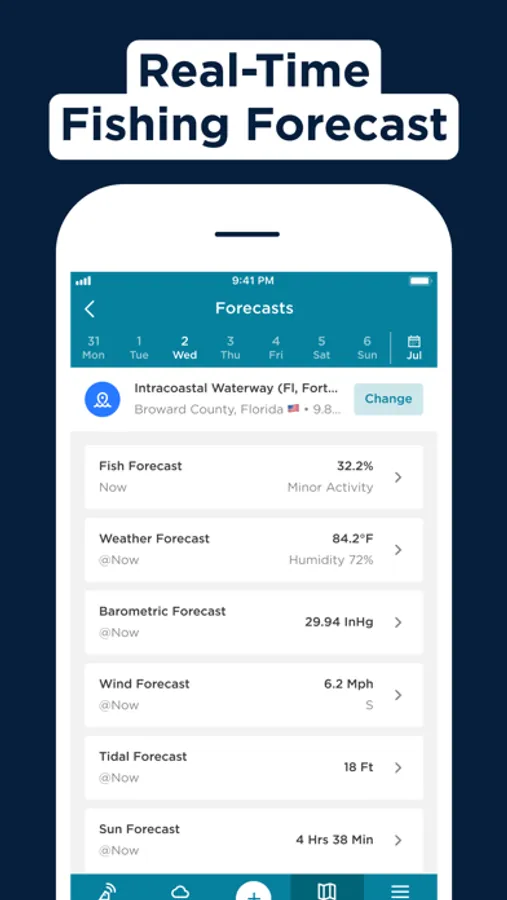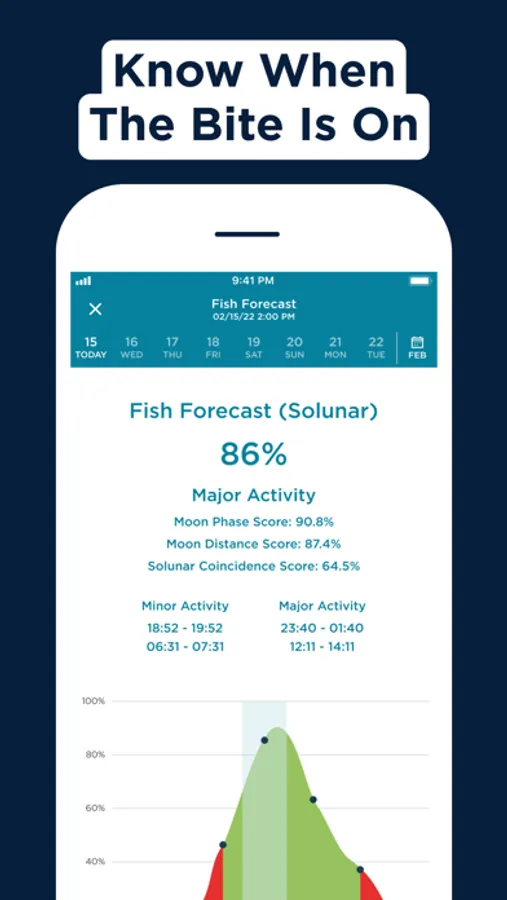 • Know when the fish are active & ready to bite based on the Solunar fishing forecast
