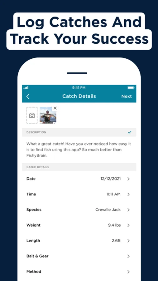 • Automatically log a catch with Fish Identification, date, time, weather conditions & water temperature.