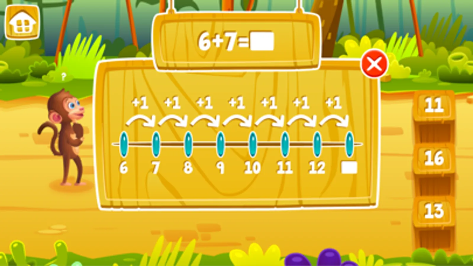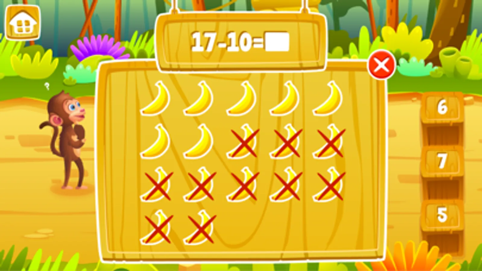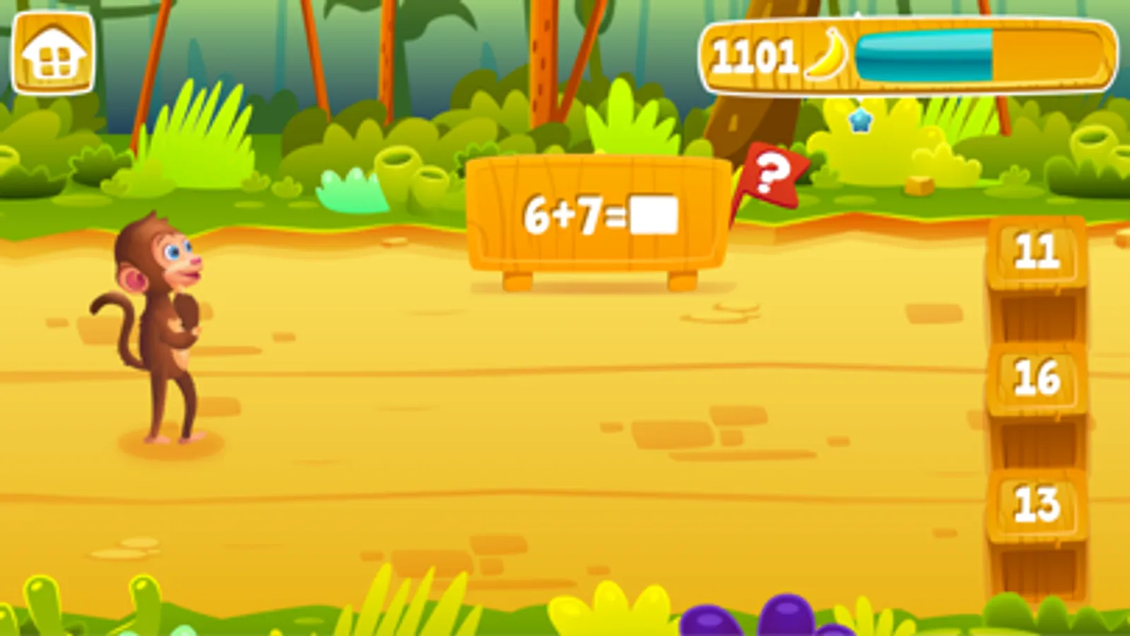 Your child will help a monkey collect bananas in a jungle. Most bananas are collected by solving math problems. Other bananas are collected through simple game play. The game includes a high score feature. This provides motivation for your child to improve. Higher scores are achieved by answering correctly. This provides incentive to focus on getting the correct answer.