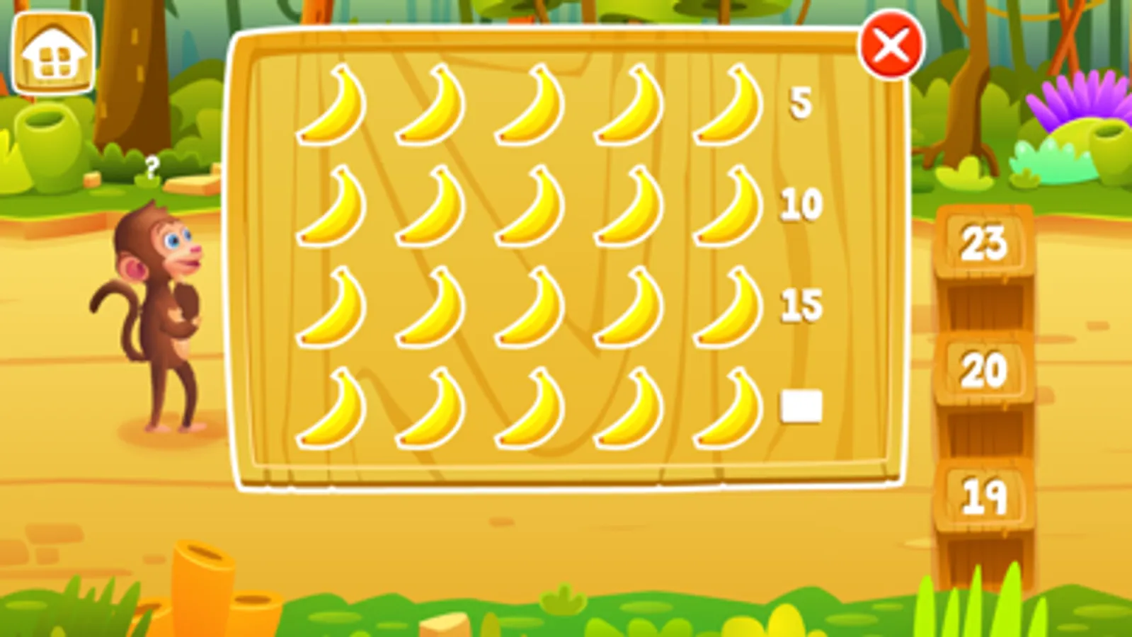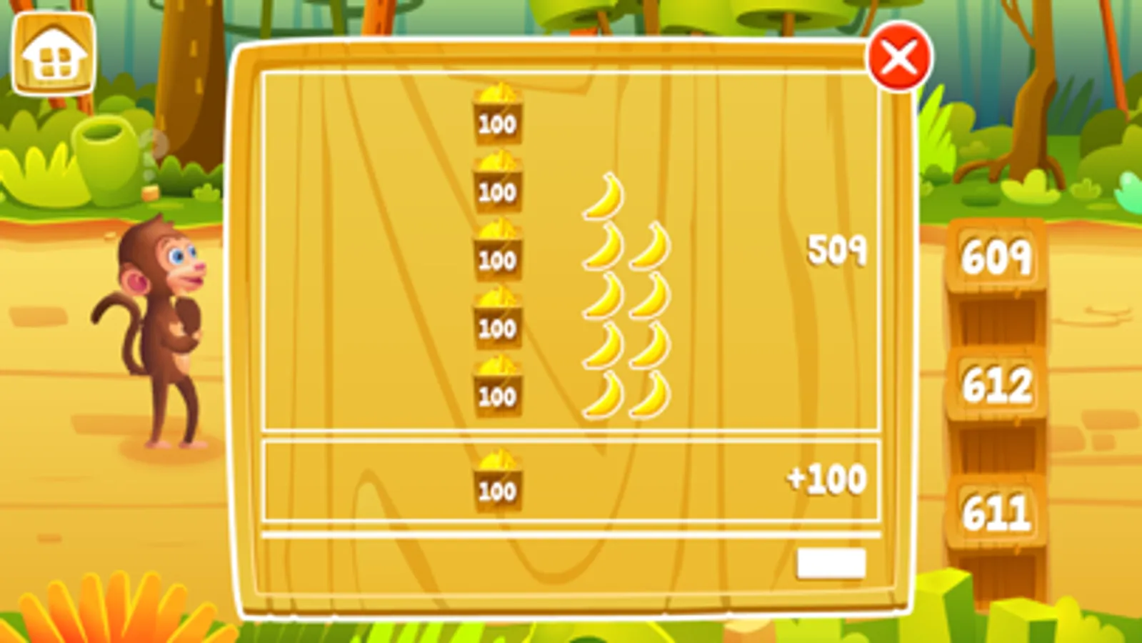 Your child will help a monkey collect bananas in a jungle. Most bananas are collected by solving grade 2 math problems. Other bananas are collected through simple game play. The game includes a high score feature. This provides motivation for your child to improve. Higher scores are achieved by answering correctly. This provides incentive to focus on getting the correct answer.