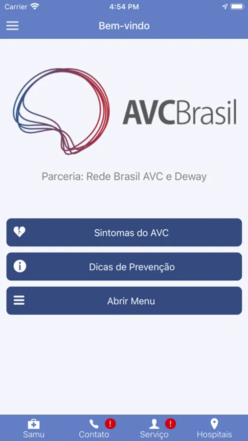 O aplicativo AVC BRASIL tem por finalidade alertar as pessoas sobre os principais sintomas do Acidente Vascular Cerebral(AVC), orientar sobre os bons hábitos de vida, disponibilizar a localização dos Centros Especializados em AVC, com filtro de endereço por geolocalizacão, facilitando o acesso do usuário e possibilitando o seu deslocamento o mais rápido possível a uma dessas unidades e efetuar ligações de emergência através de botões visíveis na tela do aplicativo.