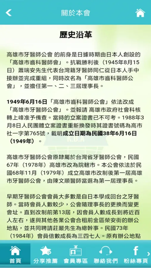 本會全名為 「社團法人高雄市牙醫師公會」,英文名稱為「Kaohsiung Dental Association of the ROC」,簡稱為"KDA"。