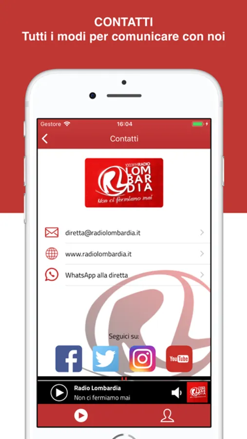 Scaricando la nostra applicazione potrai ascoltare Radio Lombardia e guardare Radio Lombardia TV ovunque ti trovi, anche quando ti sposti dalla nostra Regione o non hai una radio a portata di mano. Inoltre potrai interagire direttamente con gli speaker e condividere con i tuoi amici quello che stai ascoltando!