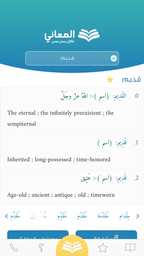 Almaany Arabic English and English Arabic dictionary is for off-line use with summarized results. you may broadband your search in the almaany.com site.