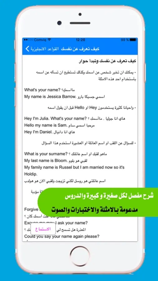 اولا وقبل كل شي البرنامج يعمل بشكل كامل بدون الحاجة الى الانترنت جميع الدروس مشروحة باللغة العربية و مدعومة بالصوت والامثلة والاختبارات.