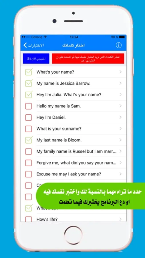 وفرنا لك اختبارات متعددة لكي تستطيع ان تختبر نفسك فيما تعلمت والاختبارات عشوائية او حسب الطلب حيث يمكنك اختيار الكلمات التي تريد ان تختبر نفسك فيها وجميع نتائج الاختبارات تسمح لك بمشاهدة اجوبتك على الاسئلة