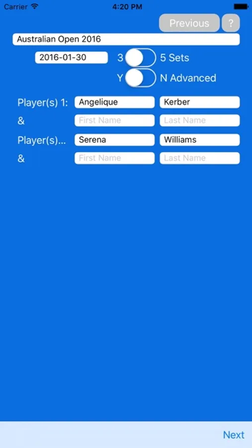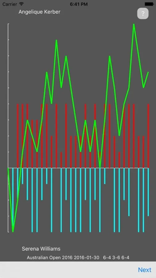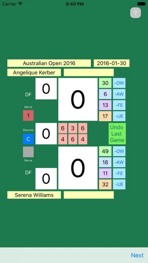 There are three ways to use it. In the simplest, just tap the score buttons to keep track of how the games went. There are four basic screens: one for match data, one to keep score, one to see graphically how the match swung or is swinging from one player to the other over time (the "tennis trend"), and one for overall statistics.
