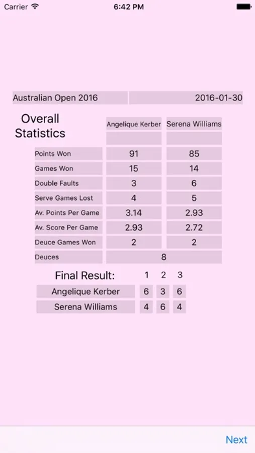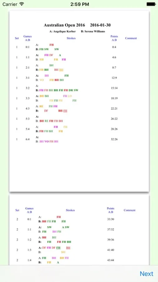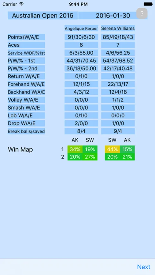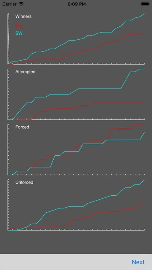 The second way is more detailed. You identify how each rally ended: outright winner, attempted winner, forced error or unforced error. These details are shown on a fifth screen game by game.