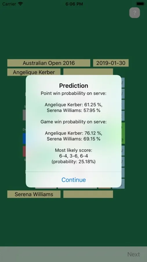 The third mode adds a record of whether the rally began with a first or second serve, and lets you specify the shot that ended the rally. This leads to an additional screen of much more sophisticated statistics, showing the success of each shot type, and the points won on first or second serve. A seventh screen shows how the match went point by point, for even deeper analysis, and an eighth shows these results graphically. In this mode you can also get a prediction of how the match is going to turn out, as you score each point.