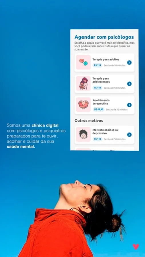 As consultas são realizadas online, pelo aplicativo, de uma forma humanizada e por um preço acessível. Todos os profissionais são próprios, qualificados e cuidadosamente selecionados a partir do valor de cuidar com amor ao longo da vida. Como funciona?