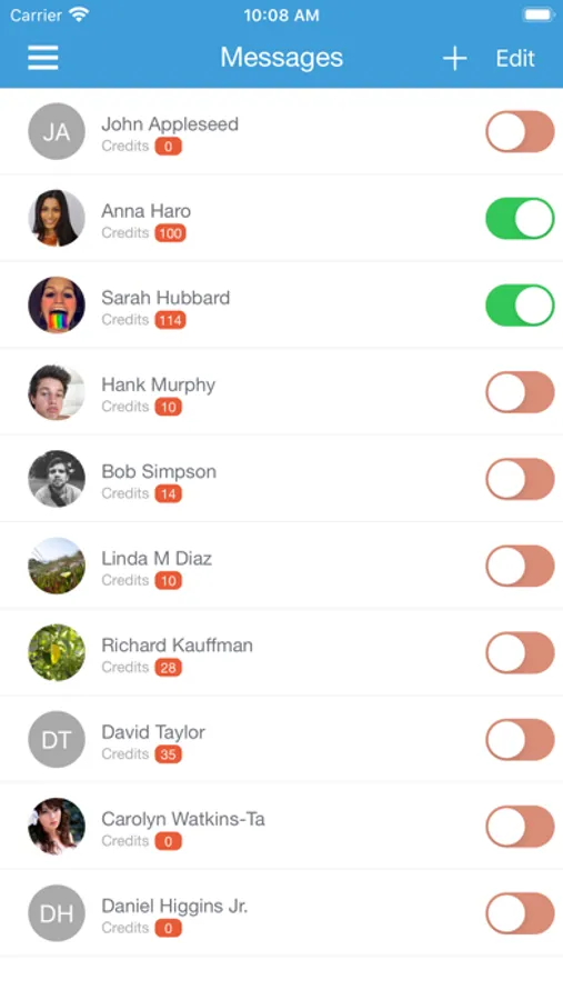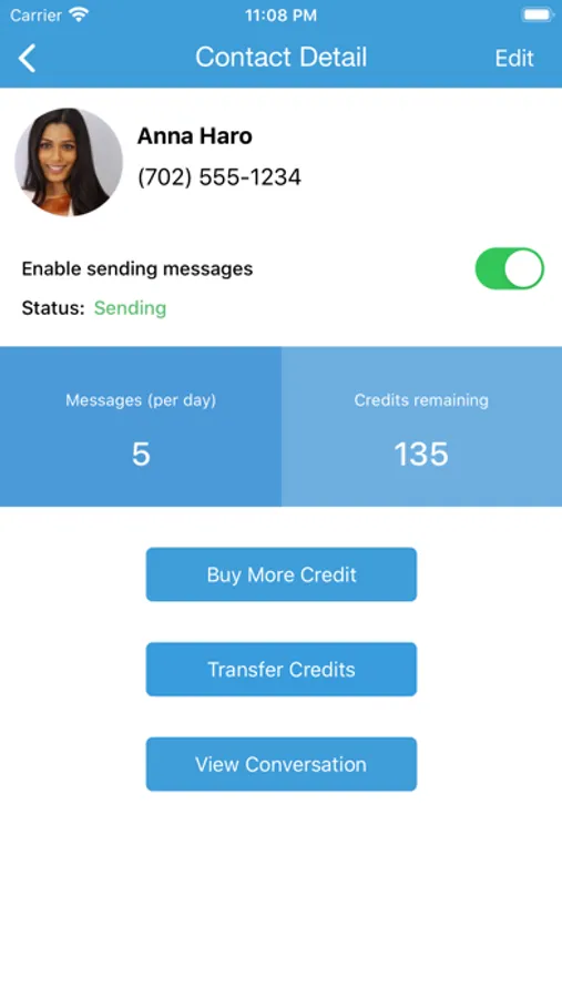 Tips: Tap on the contact's name to modify their name, phone number, profile photo and rate of delivery. You can choose the number of texts to send per day for each contact. Your remaining credits are shown here and you can view the conversation history as well. Now, you can also see the live status of your messages and transfer credits between contacts.