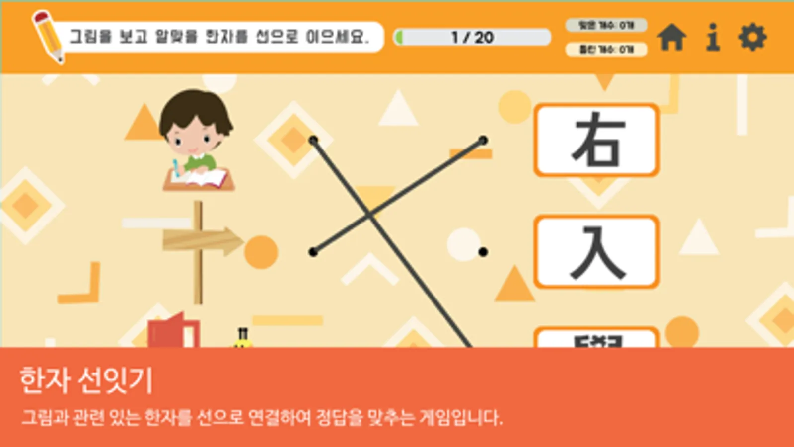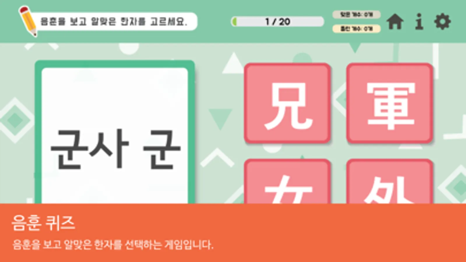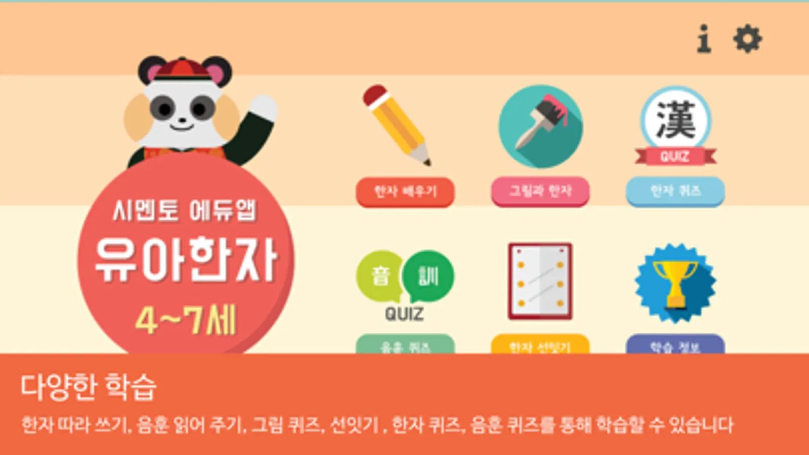 한자 배우기, 그림과 한자, 한자 퀴즈, 음훈 퀴즈, 한자 선잇기 총 5가지의 학습이 가능합니다.