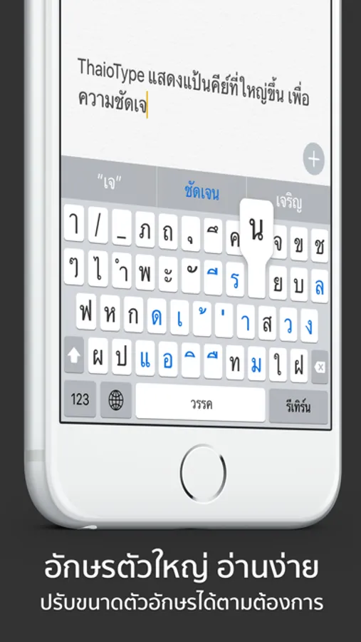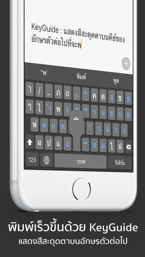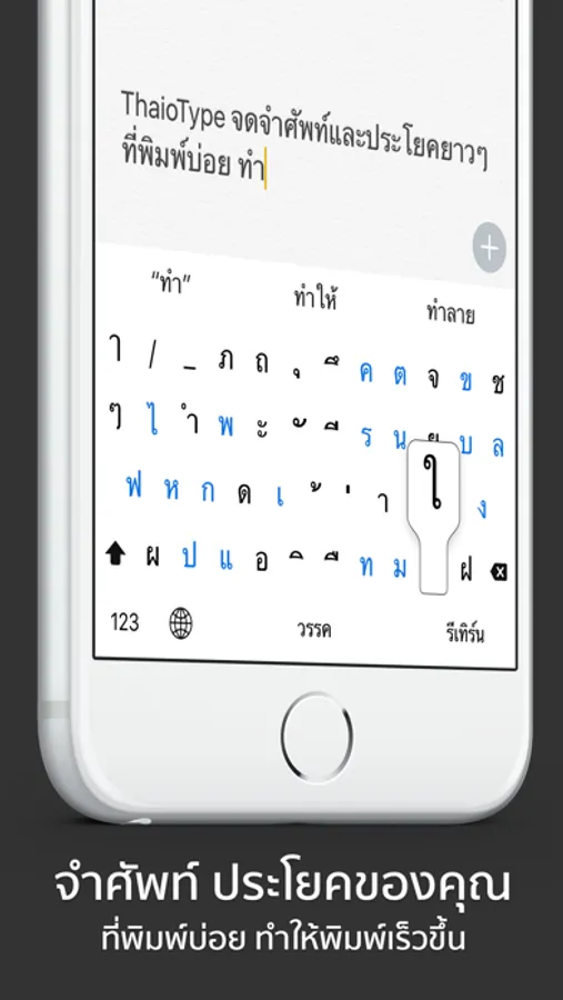 ThaioType พิมพ์ได้ลื่นไม่มีสะดุด มีคุณสมบัติเทียบเท่าคีย์บอร์ดมาตราฐาน ที่พิเศษ เพิ่มคำศัพท์ได้ และ “KeyGuide” แสดงสีของคีย์อักษรตัวต่อไปที่พิมพ์ได้
