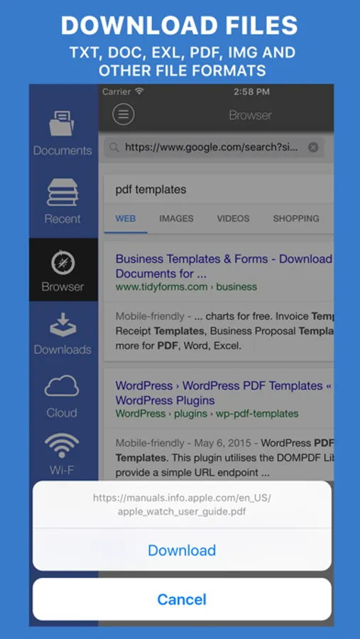 - Download files: DOC, XLS, PDF, TXT, IMG, PNG, JPEG and more