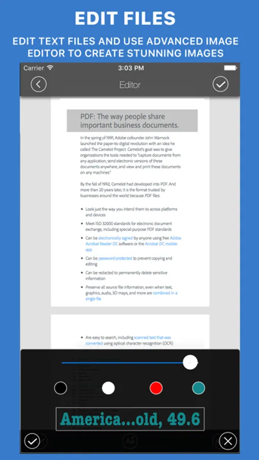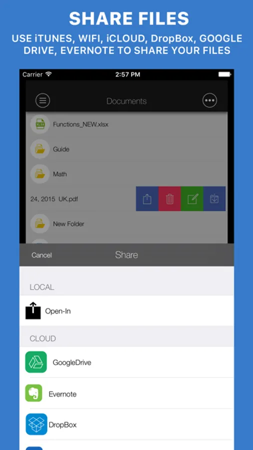 - Share files: iTunes, WiFi, iCloud, DropBox, Google Drive, Evernote, Box