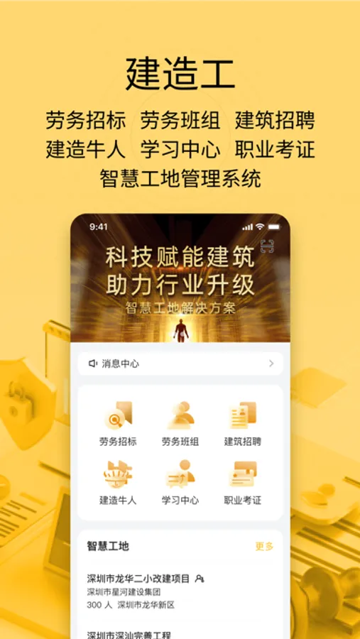 建造工劳务云,为总包、班组、工人提供优质的线上劳务服务,劳务招标、劳务班组、建筑招聘、建造牛人、学习中心、职业考证等版块为广大用户提供丰富的建筑资源!海量总包、班组、工人汇聚建造工劳务云,快速撮合业务,筛选优质资源,降低使用门槛,用科技的方式助力建筑行业从业者。