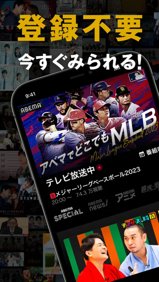 「ABEMA」はテレビのイノベーションを目指し“新しい未来のテレビ”として展開する動画配信事業。登録は不要で、国内唯一の24時間編成のニュース専門チャンネルをはじめ、オリジナルのドラマや恋愛番組、アニメ、スポーツなど、多彩なジャンルの約20チャンネルを24時間365日放送しています。