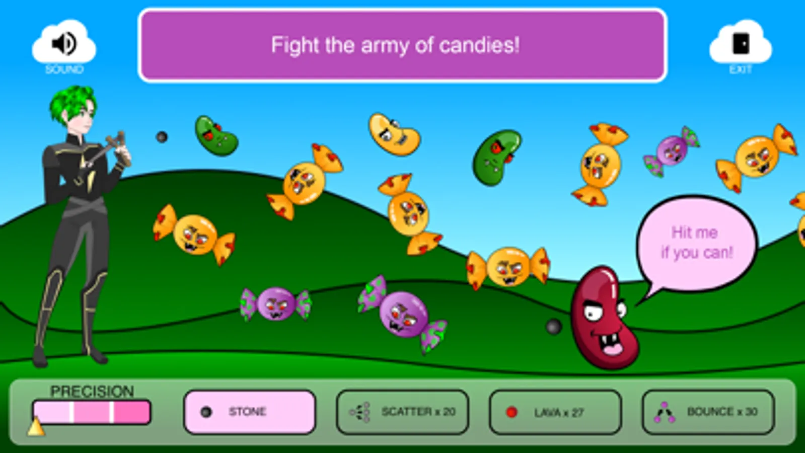 You are under attack! An army of candies is coming at you. They jump, they pop, some split into pieces…