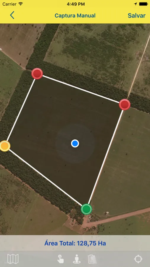 Estão disponíveis 02 modos de operacionalização: Captura Automática - onde o usuário faz o contorno da área e a cada 10 segundos o GPS interno do aparelho marca um ponto; e Captura Manual - marcando-se os pontos, no local, usando a função GPS ou com ajuda de um mapa de satélite. Esta última opção somente funcionará com a existência de rede e função dados móveis do aparelho ativada.