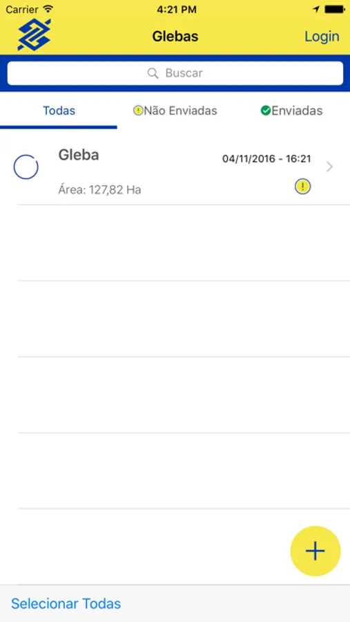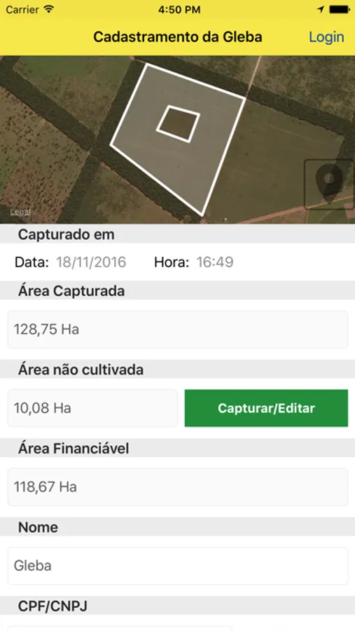 O aplicativo permite salvar os dados para testes ou validação da área, sem necessidade de autenticação. Para o envio das informações, é permitido o login tanto para pessoas físicas, quanto para pessoas jurídicas.