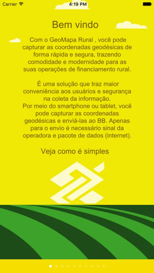O Banco do Brasil disponibiliza ferramenta de apoio ao produtor rural: o aplicativo “GeoMapa Rural” para uso em smartphones e tablets. Trata-se de uma solução inovadora para captura das coordenadas (latitude e longitude) das áreas da propriedade rural, que gera informações necessárias à contratação de financiamentos no BB, contribuindo para o ganho de agilidade e eficiência na tomada de crédito.