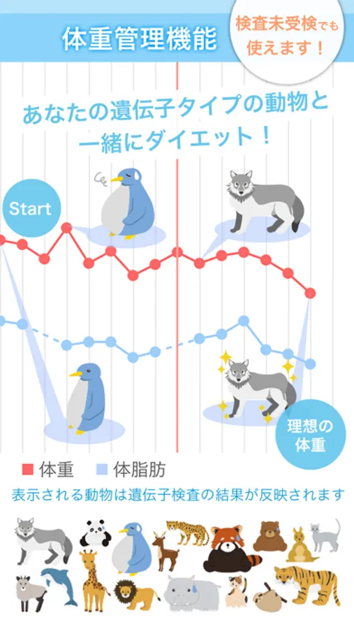 遺伝子検査結果ででた遺伝子タイプ別の動物と一緒に体重管理。