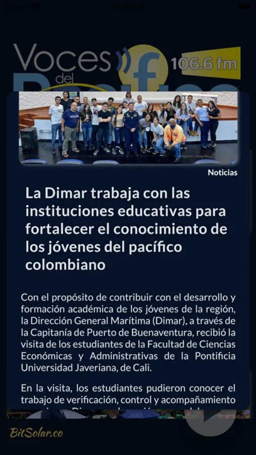 Voces del Pacífico 106.6 FM. Emisora comunitaria de la ciudad de Buenaventura, Valle del Cauca, Colombia, lanza su nueva app para darle a sus usuarios la oportunidad de escuchar la emisora desde cualquier iPhone / iPad.