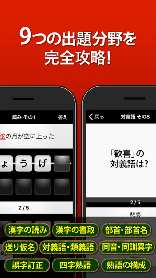 「読み」「書取」「部首」「送り仮名」「対義語・類義語」「同音・同訓異字」「誤字訂正」「四字熟語」「熟語の構成」の9分野、