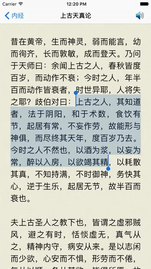 点击右上角的喇叭则阅读选定的文本,不选定文本则阅读全文。再点击喇叭则停止声音。