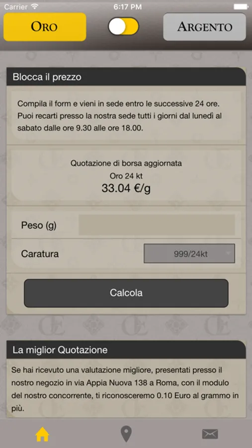 Compila il modulo inserendo il peso e la caratura del metallo (es. 18kt o 999) e metti i tuoi preziosi al riparo dalle repentine oscillazioni del mercato