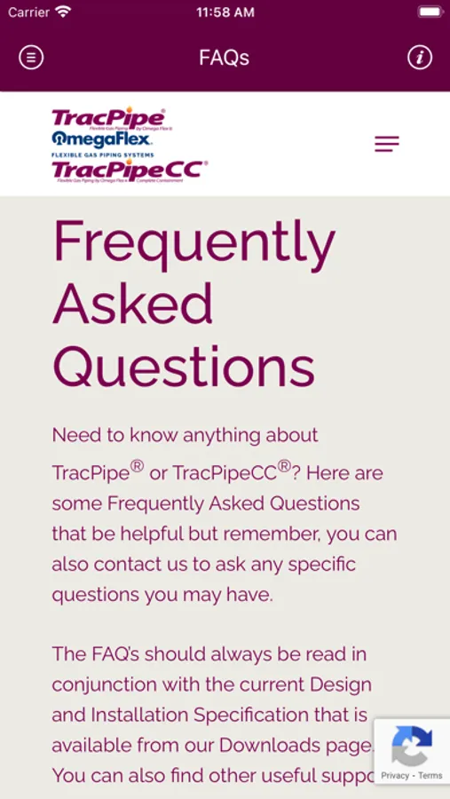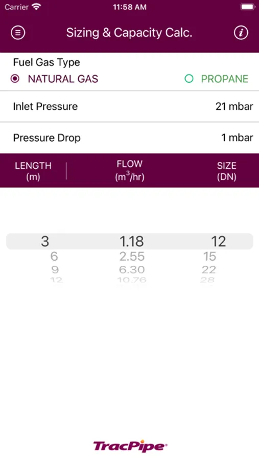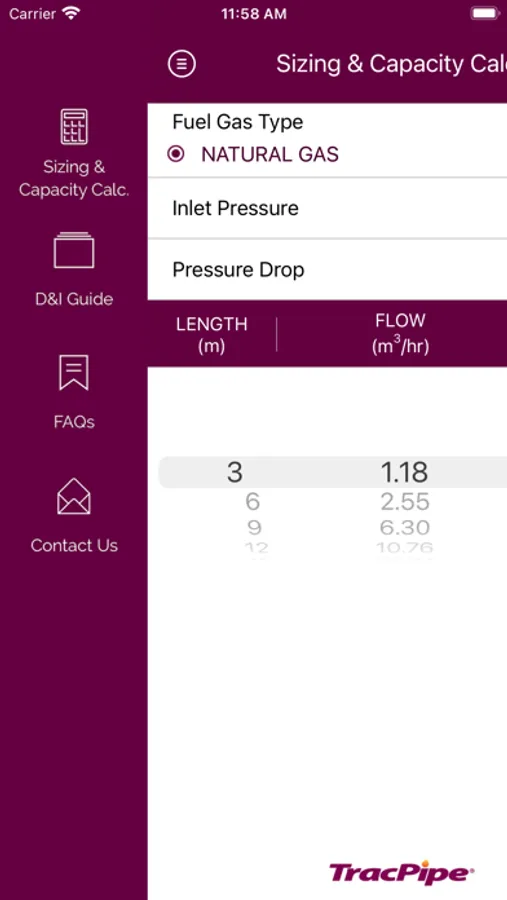 This App allows the user to size the TracPipe® Flexible Gas Piping product, using an appropriate sizing method. The App displays the appropriate size of TracPipe® for a given capacity depending on the type of gas, supply pressure and allowable pressure drop selected by the user. By selecting the design parameters using easy drop down menus the user then chooses the length of pipe and tubing size, on the easy to read calculator wheel, to find the capacity capable of being delivered by any of the seven sizes offered by TracPipe®.