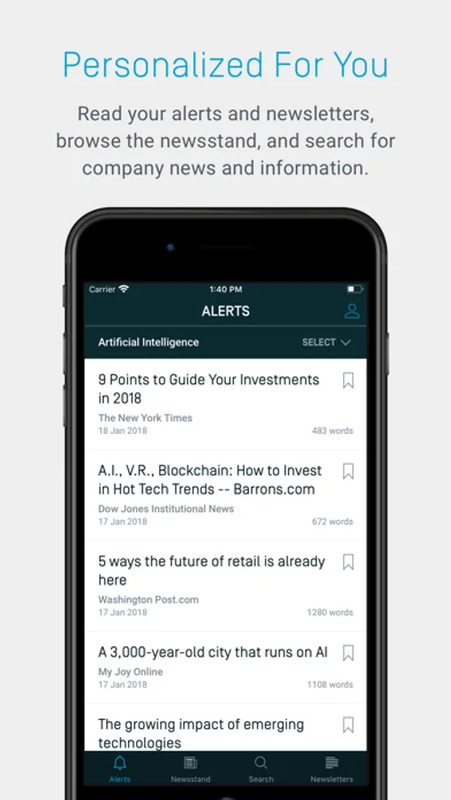 Personalized for you: Easily track highly specific news that is tailored to drive your business decisions while you’re on the go. Scroll through your custom alerts, company newsletters, and relevant news in newsstand whenever, wherever.
