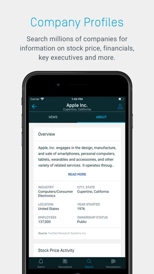 Surface what you need: Search for news and key data on hundreds of thousands of public and private companies directly within the app, including stock price activity, financials, general information and key executives.