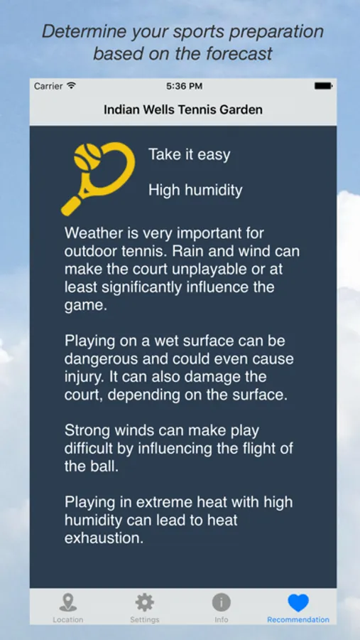 - SportsWeather evaluates the weather conditions for playing tennis, golf, baseball or soccer. The evaluation takes into account weather conditions that are relevant for the selected sports, for example, temperature, precipitation, strength of the wind, and relative humidity. A green rating indicates the weather is ideal for the sports. A yellow rating indicates the sports should be carried out with care or postpone for the next hour. A red rating indicates the weather condition is not good for the sports at all.