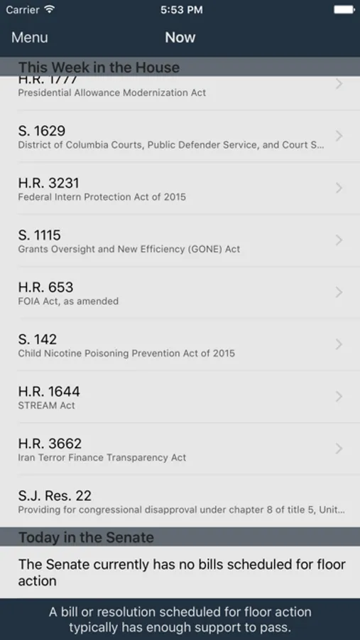 -View which bills are scheduled for immediate discussion by the House and Senate