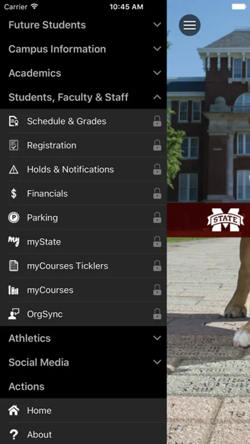 Mississippi State University’s app, myState Mobile, keeps you connected to the Bulldog family wherever you are. Learn about upcoming events, find your way around campus, and keep up with the latest in news and sports. Check your grades and schedule, and register for classes from your smartphone or tablet. myState Mobile provides information and resources that will help you Ring True at MSU.