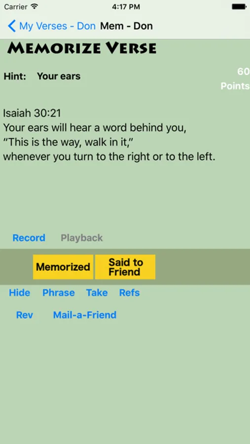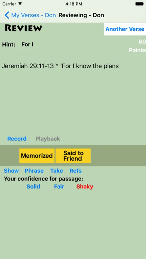 - Memory games such as Show/Hide, Phrases (show a phrase at a time), Word Take-Away, and Reference ID (gives the Scripture text and lets you choose the reference)