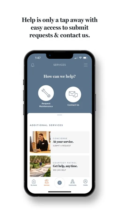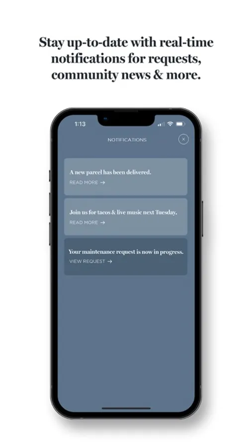- Real-time notifications detailing the progress of maintenance service requests, community updates and parcel delivery status*.