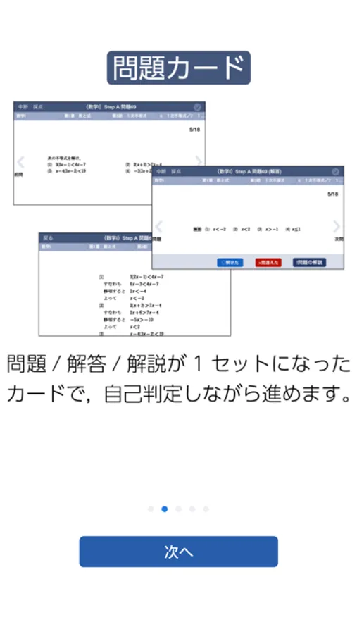 「問題/解答/解説」が1セットになったカードです(解説がない学習コンテンツもございます)。