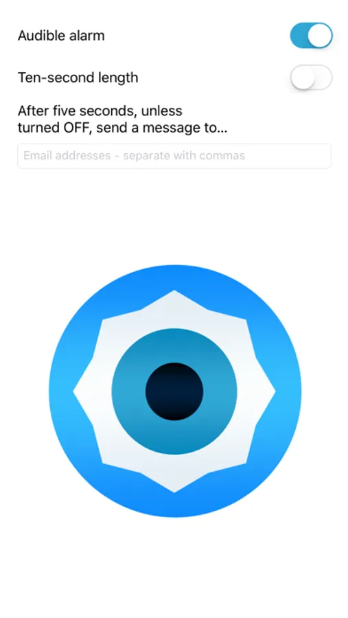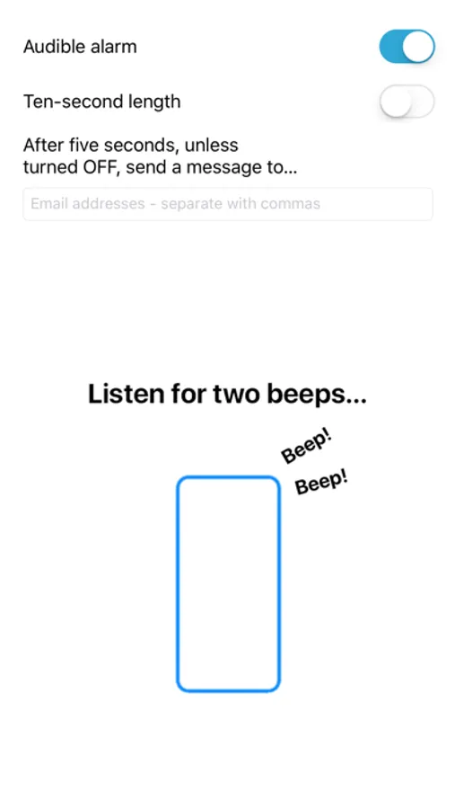 The app uses an audible alarm. Optional features include sending an alert silently through email or SMS gateway.