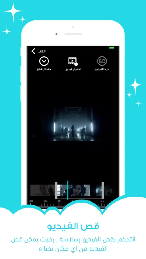 ٢ - امكانية اختيار المكان المناسب للقص من الفيديو بحيث يظهر شريط في الاسفل يمكن تحريكه واختيار الجزء المراد قطعه