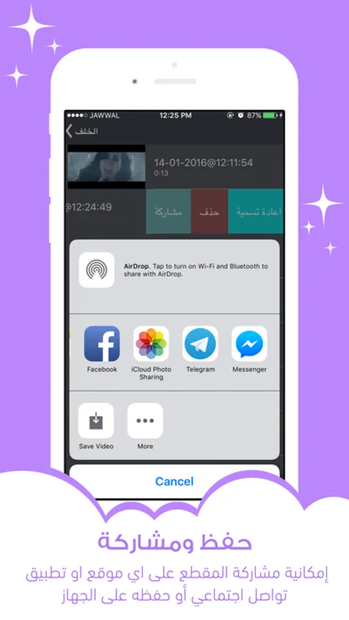 ٥ - امكانية مشاركة الفيديو لأي موقع أو تطبيق اجتماعي وأيضا حفظه على الجهاز الخاص بك