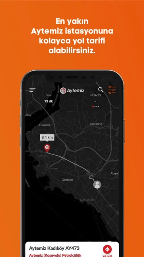 - “İstasyon Bul” sekmesinden size en yakın Aytemiz istasyonlarını görebilir, gitmek istediğiniz istasyon için mesafe ve zaman bilgisine ulaşabilirsiniz.