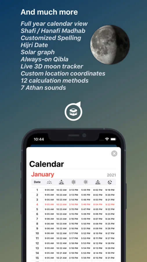 - Full year athan calendar table (visible on swiping up from the athan times table)